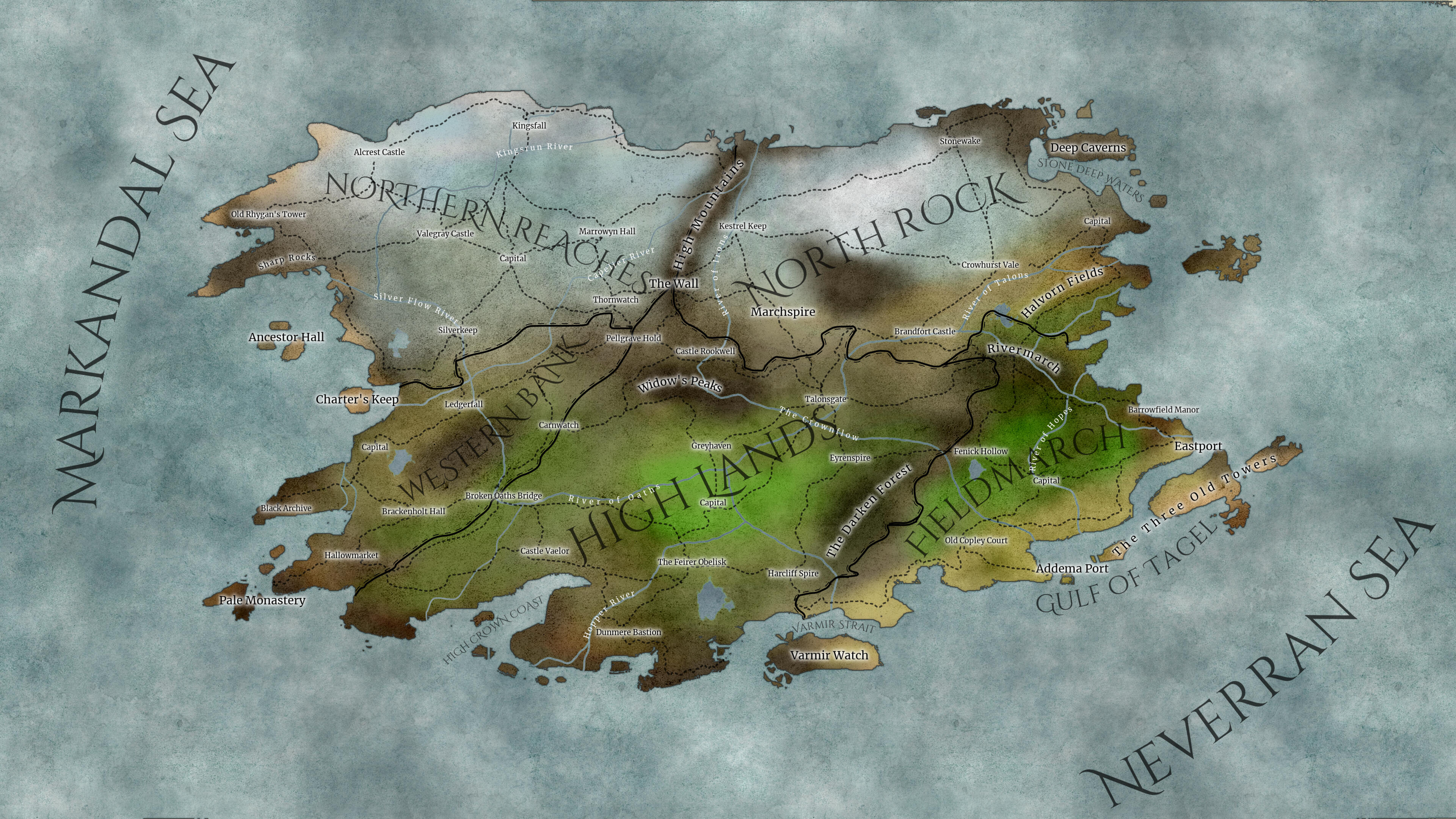 The Northern Reaches Kingdom occupies the far northwestern edge of Averon, shaped by cold seas, ancient stone, and lingering memory of the Old Kingdom’s ideals. Ruled from the inland capital of Kingsreach, deliberately set south of the exposed coast, the realm balances maritime vigilance with inward-looking tradition. The northern shoreline is crowned by Kingsfall, an ancient imperial seat overlooking the Markandal Sea, while the western coast is guarded by Alcrest Castle and Old Rhygan’s Tower, standing watch over the treacherous Sharp Rocks.Offshore to the southwest lies Ancestor Hall, a solemn island tied to lineage, burial, and oath remembrance. Inland, the Silver Flow River runs south past Silverkeep, carrying both trade and authority into the Western Bank, while the eastern interior rises sharply into the High Mountains, forming a natural barrier against North Rock. Noble power is anchored by fortified halls such as Valegray Castle in the west and Marrowyn Hall near the mountain foothills, reinforcing old alliances and guarded roads. At the southern edge of the kingdom, Thornwatch stands beside The Wall, marking the hard border with the High Lands and serving as both fortress and ideological boundary.The Northern Reaches value honor, oaths, and restraint above ambition, holding fast to customs that predate the Sundering and judging rulers not by expansion, but by dignity, memory, and endurance.